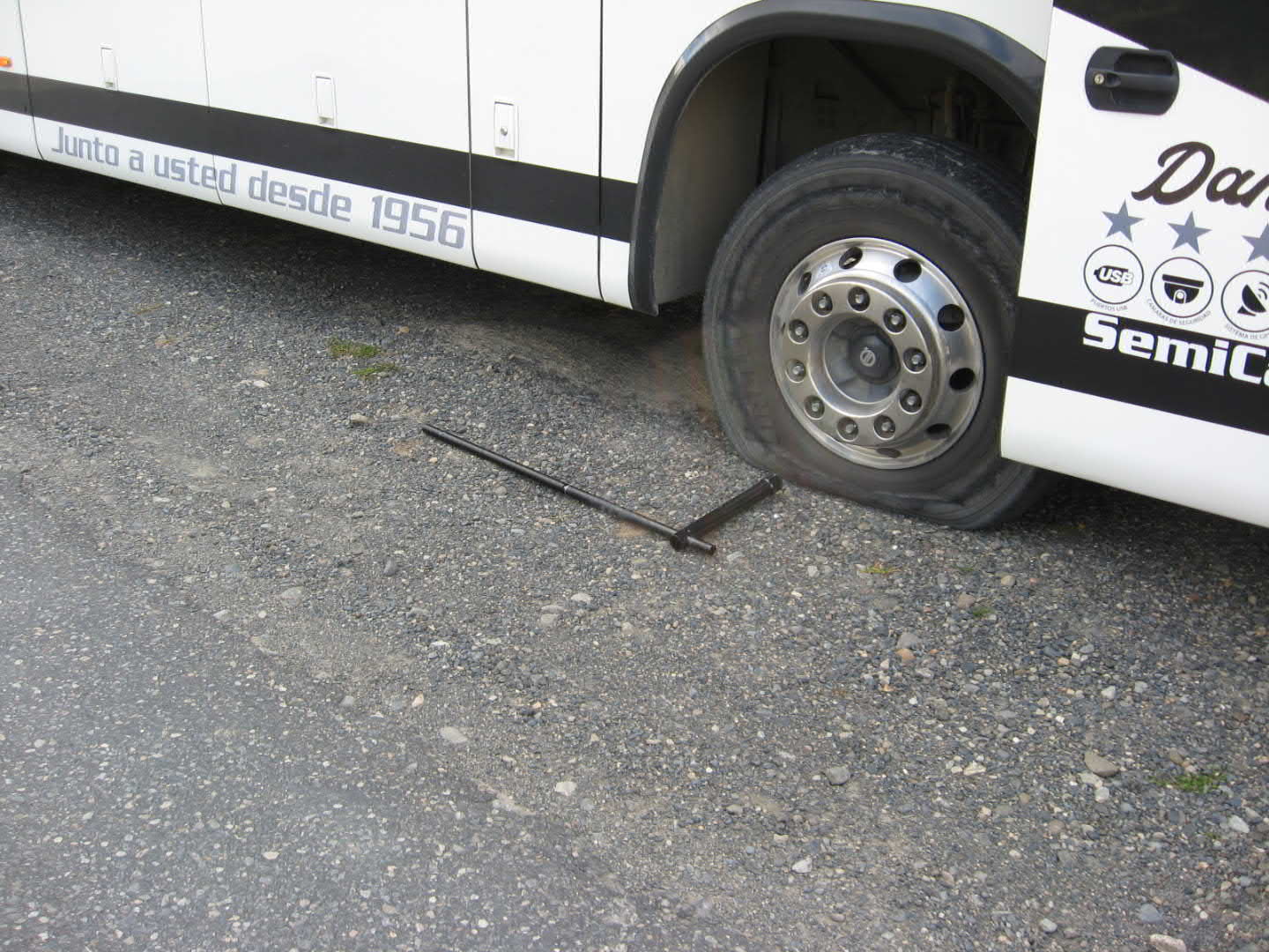 unser Bus vorne links einen Platten,aber das war für den Fahrer kein Problem. In 20 Minuten war die Panne behoben!