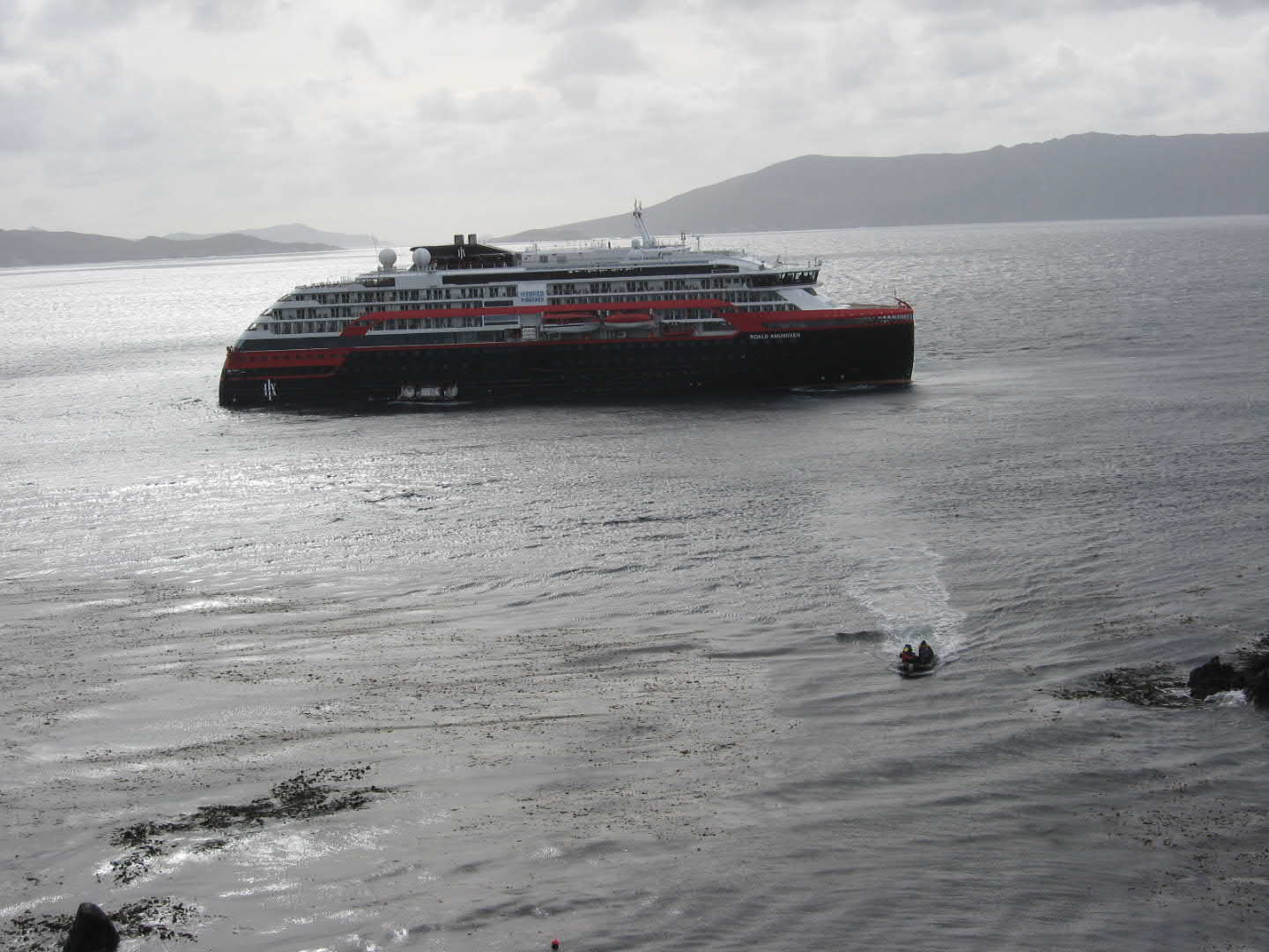Die MS - Roald Amundsen lag wieder auf Reede, da das große Schiff nicht an den mikrigen Piers anlegen konnte: